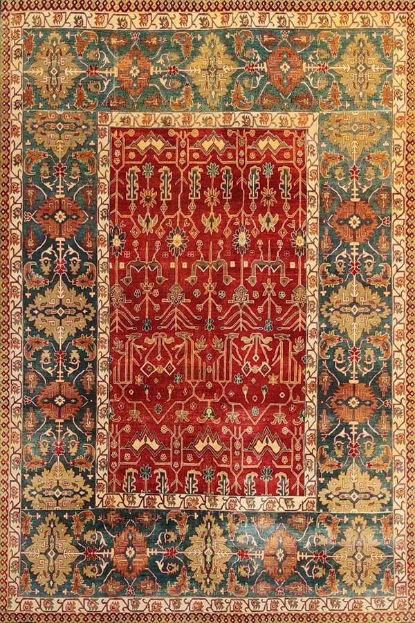 Hand knotted with a traditional craft technique but a contemporary approach, this rug is just as much about durability as it is about its visual appeal. Its design scheme encapsulates rich scarlet shades, which has been further enhanced by intricate patterns in golden and brown. Its wide border at all its ends that contains intricately designed motifs within provides this rug with a royal aesthetic. Bringing the magnificence of the Persian saga too your home, this rug is a perfect piece of adornment for every space in a home, be it your living room, dining room, bedroom, or even the backyard.